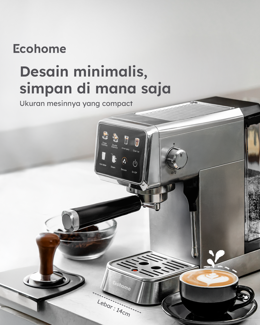 Jangan khawatir soal ruang, mesin espresso Ecohome ini memiliki desain ringkas dan hemat ruang, dengan lebar hanya 14 cm, menjadikannya salah satu mesin kopi terbaik untuk dapur minimalis. Balutan baja anti-karat yang elegan tidak hanya memberikan kesan premium, tetapi juga menjamin ketahanan jangka panjang dan perawatan yang mudah. Kontrol suhu presisi NTC menjamin rasa kopi yang konsisten dan sempurna di setiap seduhan.